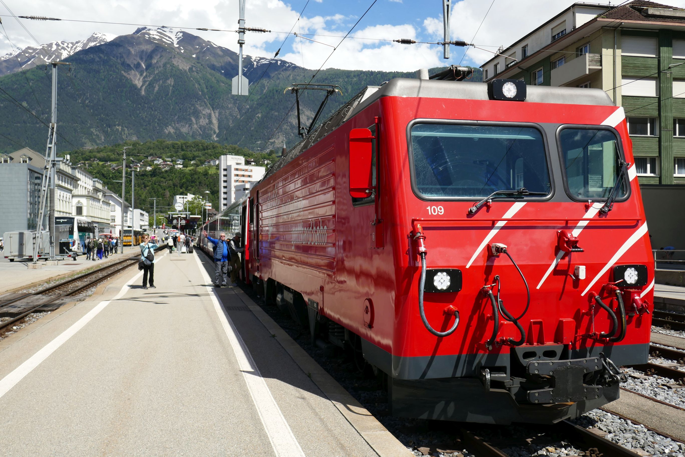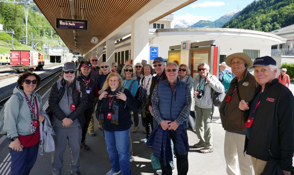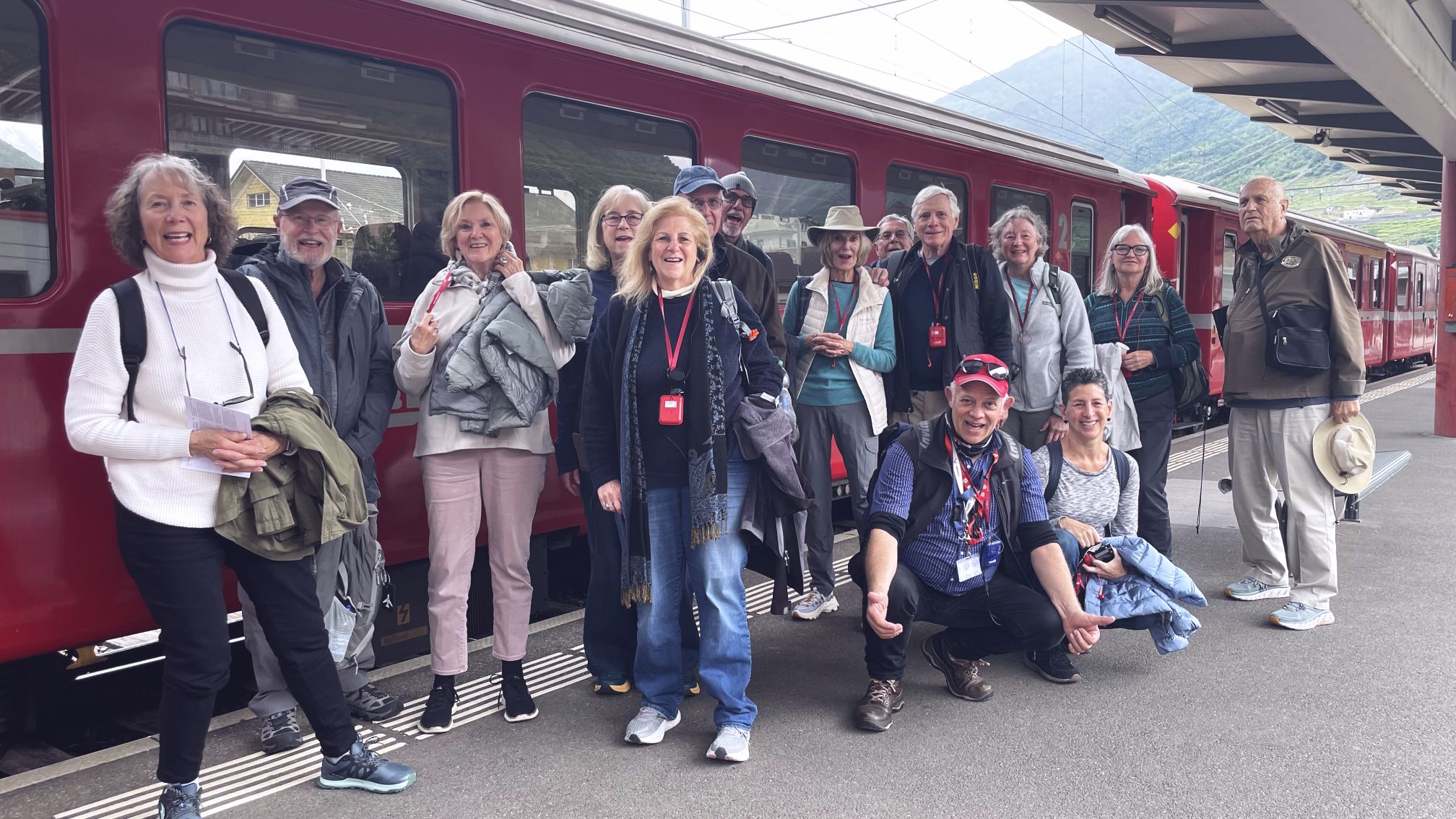 The view of our train from our hotel room in Tirano. We were so excited to wake up to a beautiful day!This was just the beginning of many beautiful scenes to come on our 30-mile Bernina Express Journey.Our group, waiting for Bernina Express train, #2.