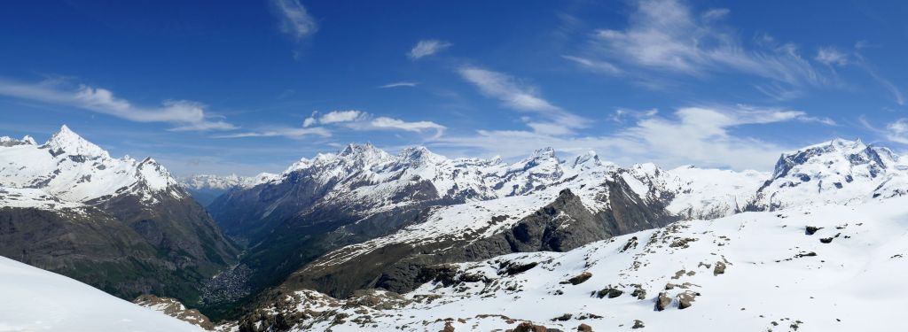 Those clouds I mentioned earlier? There they are! This is that white-on-white I was talking about; snow against a mucky sky. Zermatt is in the valley off in the distance, and where I was headed during my solo hike.