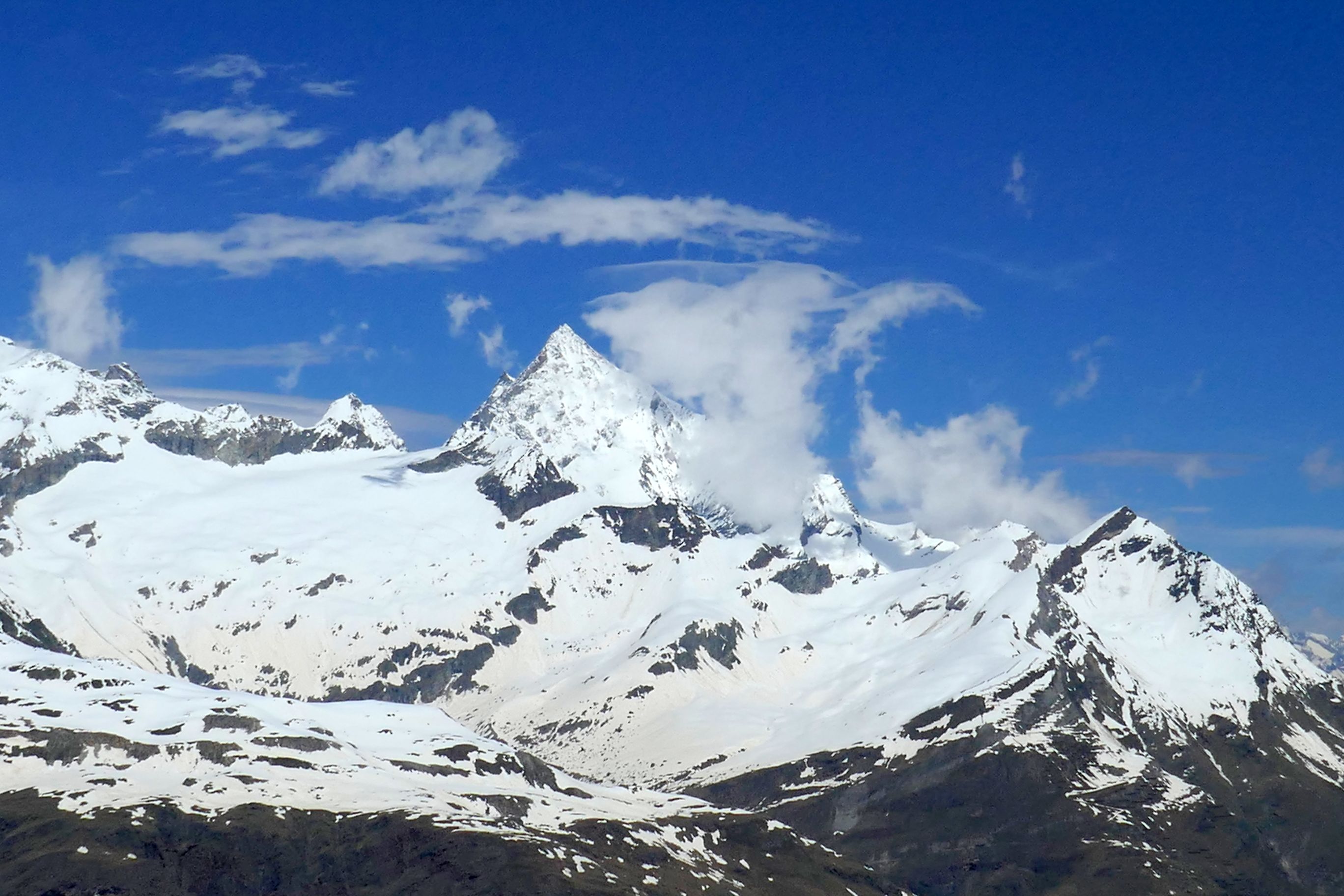 Here we were seeing the real thing, as close as we could get without getting in the snow and hiking to it. What a sight to behold! The highest point is at an elevation of 14,691 feet and we were viewing it from Trockener Steg at 9,642 ft. And, we had the entire viewing deck to ourselves for a while. Where was everybody?