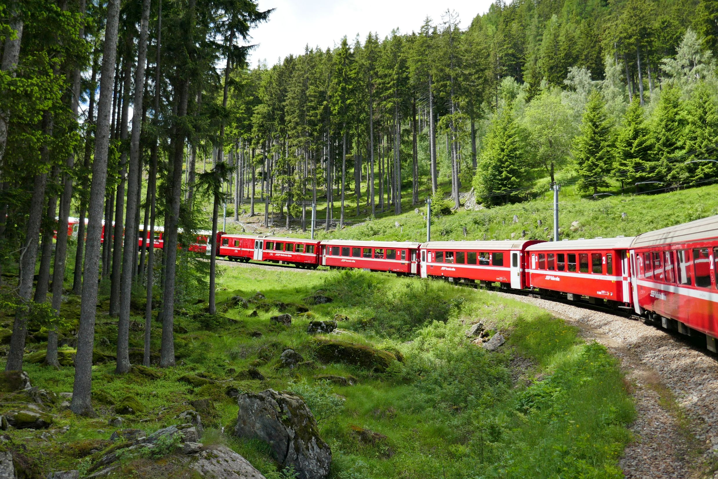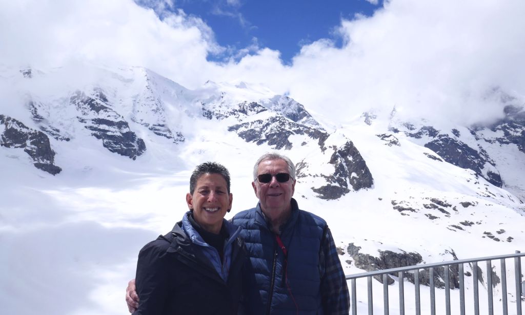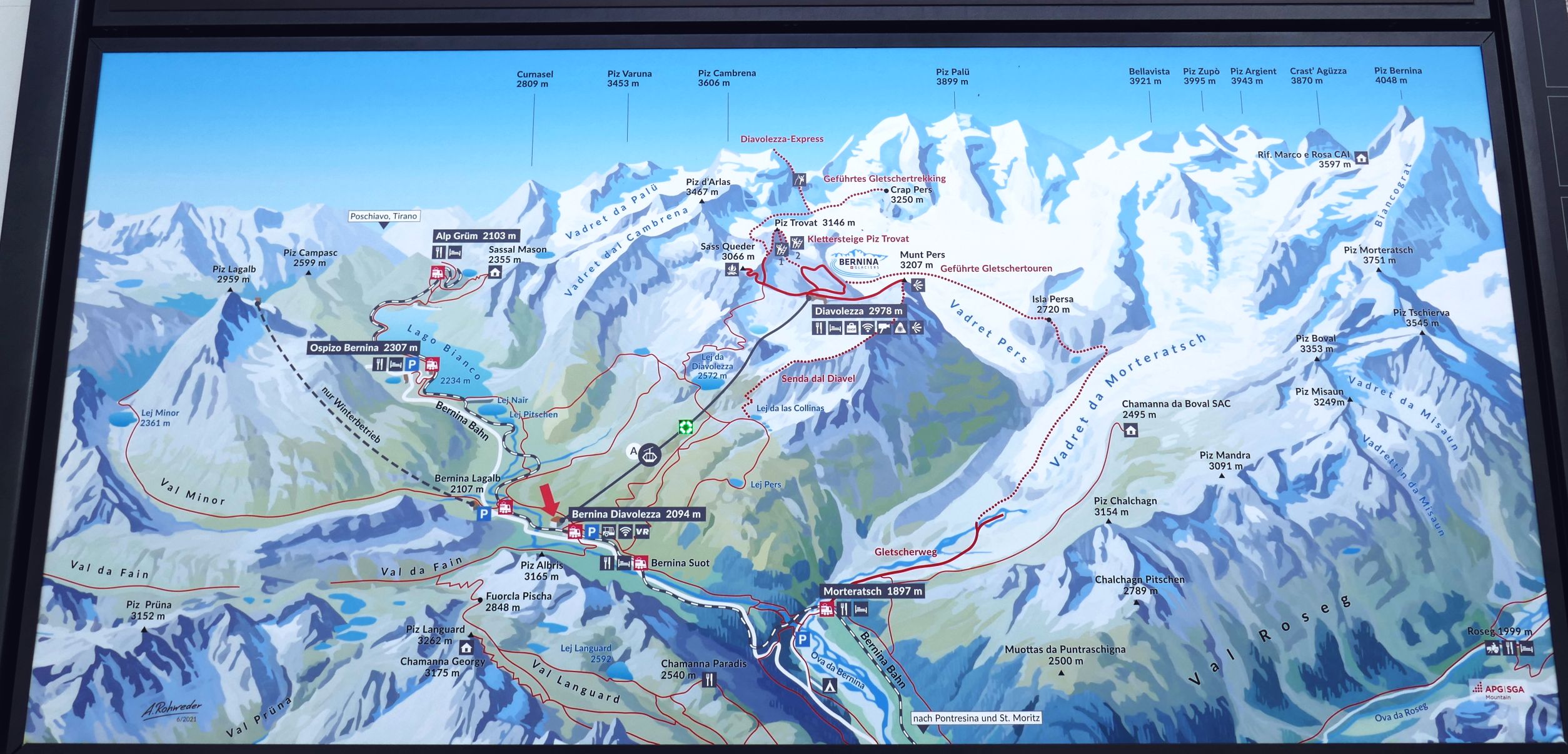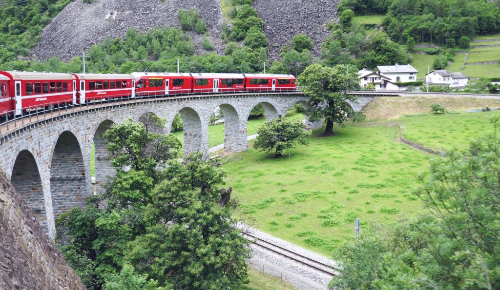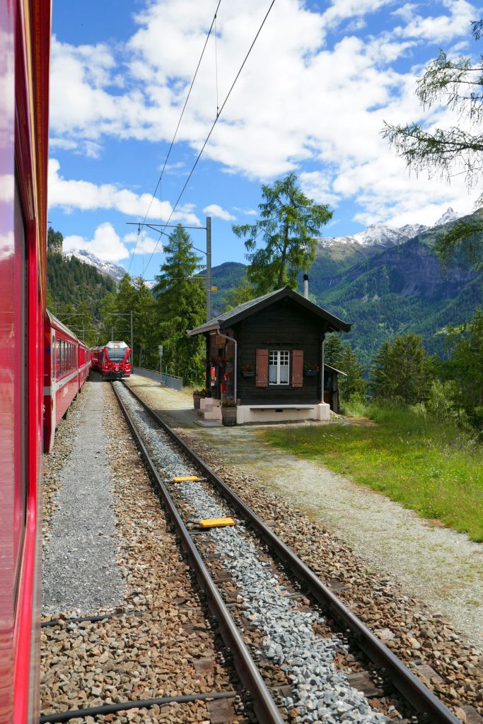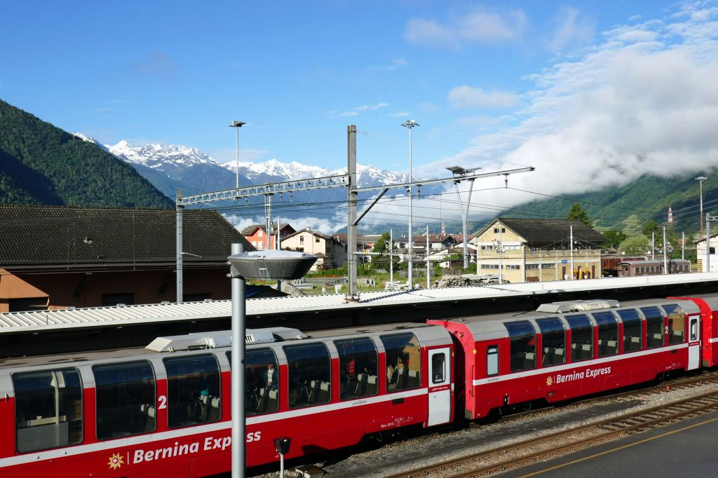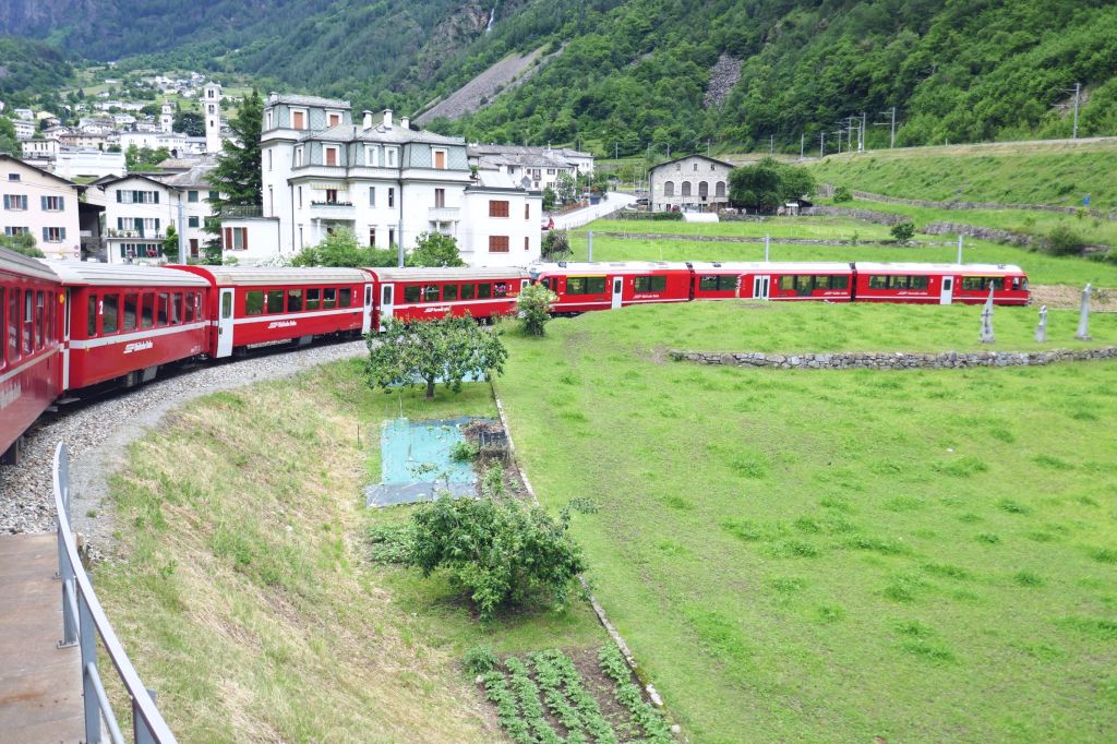 This day was what Bruce and I had looked forward to the most: Riding the Bernina Express. It is one of the few rail journeys designated a UNESCO World Heritage Site. Not only is it the world’s highest Alpine crossing (reaching an altitude of 7,400 feet), but also the steepest, with gradients up to 7%.