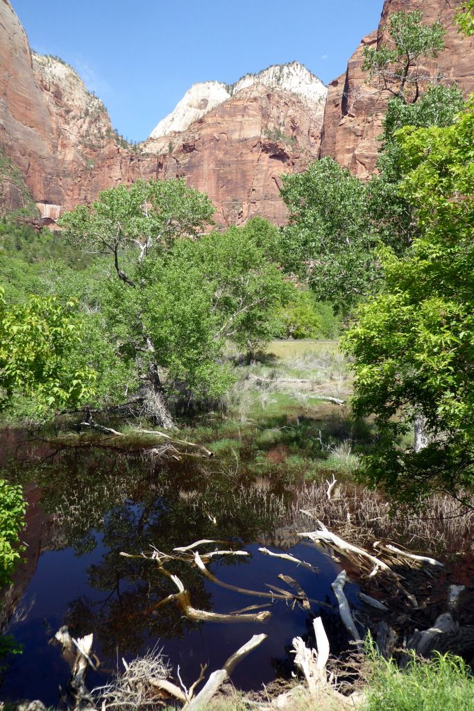 The Navajo sandstone in the rock formations is gorgeous; beautiful, rich shades of red.  A Wikipedia article about Zion describes the geology as, “… nine formations that together represent 150 million years of mostly Mesozoic-aged sedimentation.  At various periods in that time warm, shallow seas, streams ponds and lakes, vast deserts, and dry near-shore environments covered the area.  Uplift associated with the creation of the Colorado Plateau lifted the region 10,000 feet (3,000 m) starting 13 million years ago.”  I’ll take the author’s word for it.  All I know is that it was gorgeous, the sky was a beautiful shade of blue, and the Navajo sandstone formations set against the blue sky was spectacularly colorful!  It made for an inspiring day of photography, as we hiked to the Emerald Pools and back.