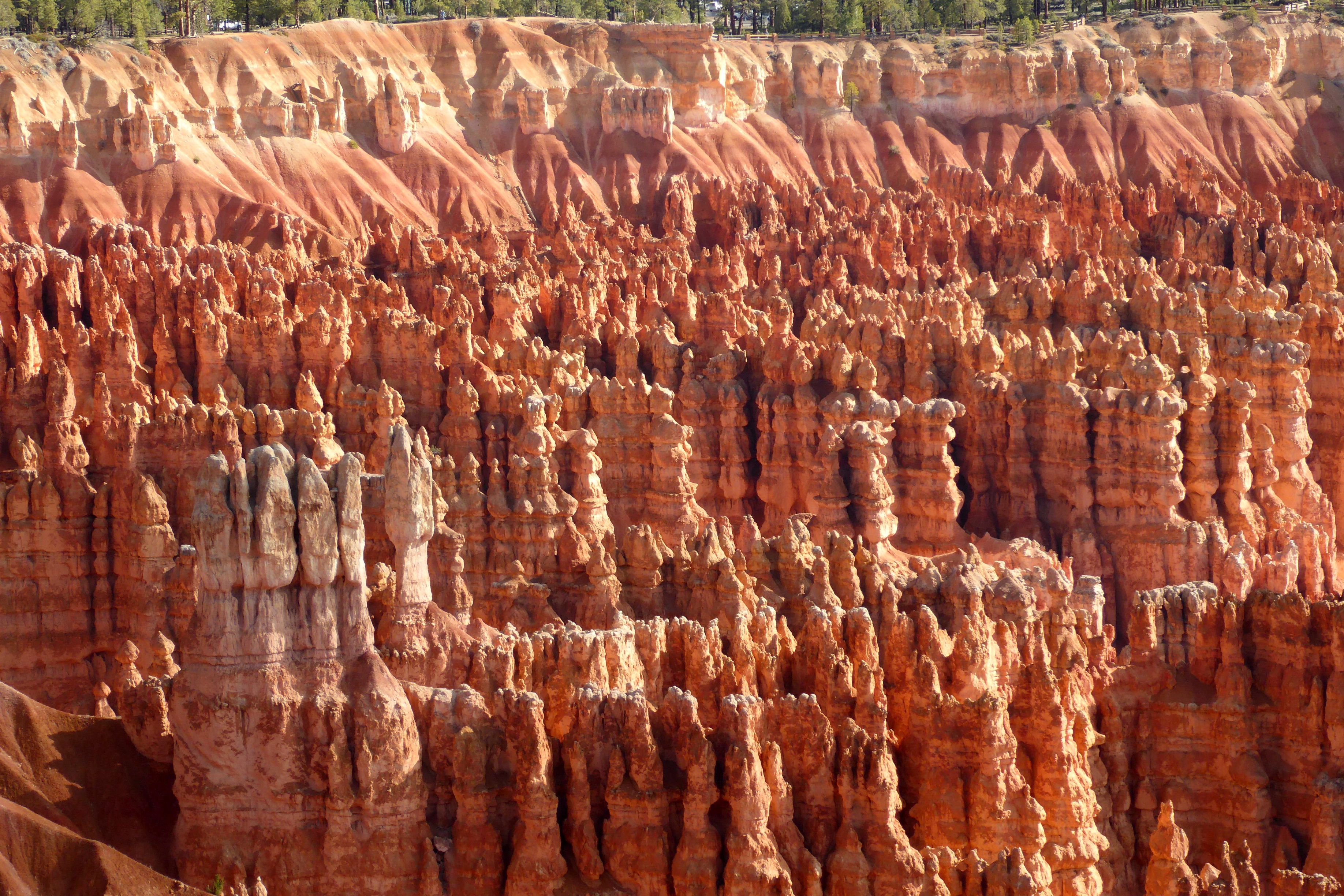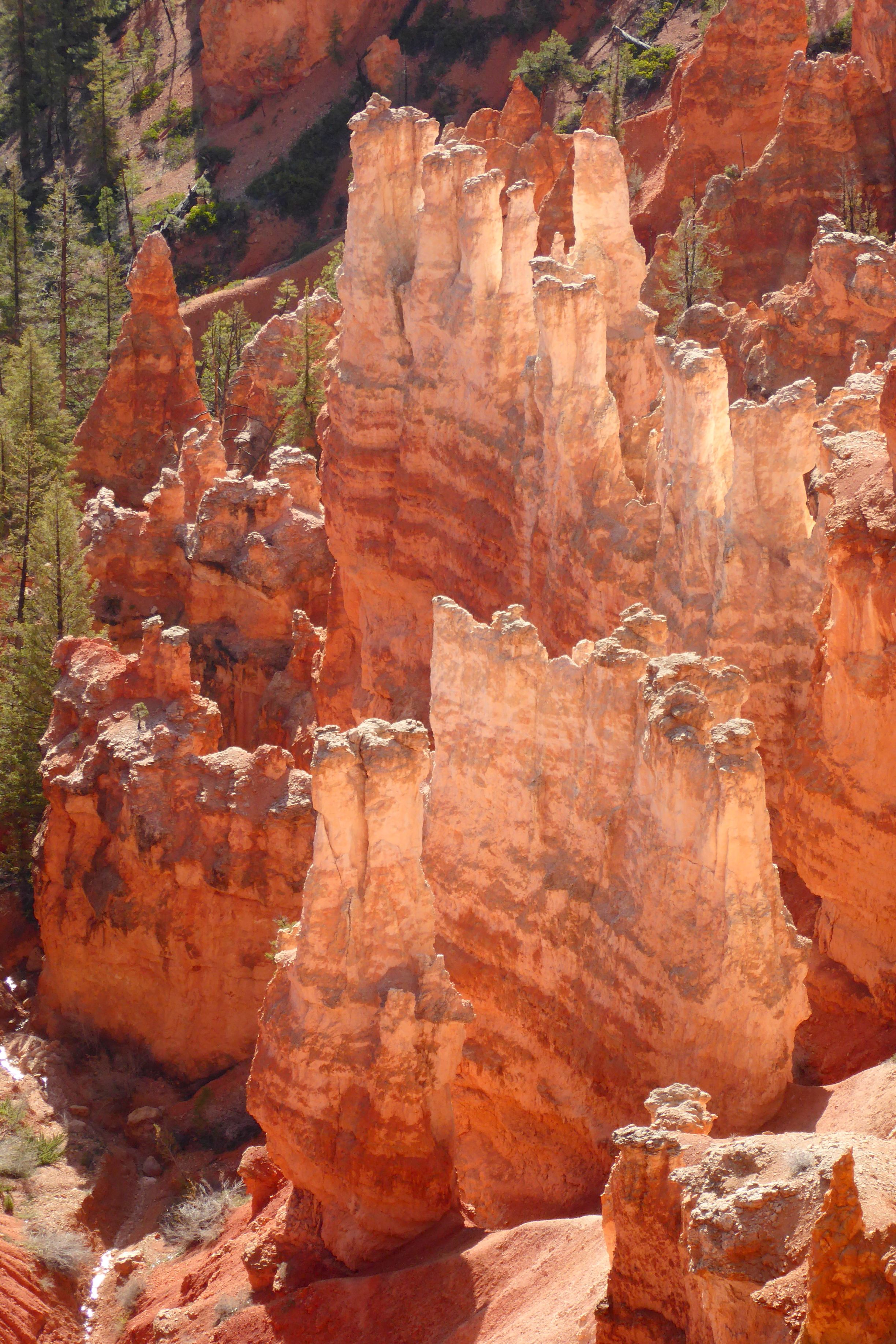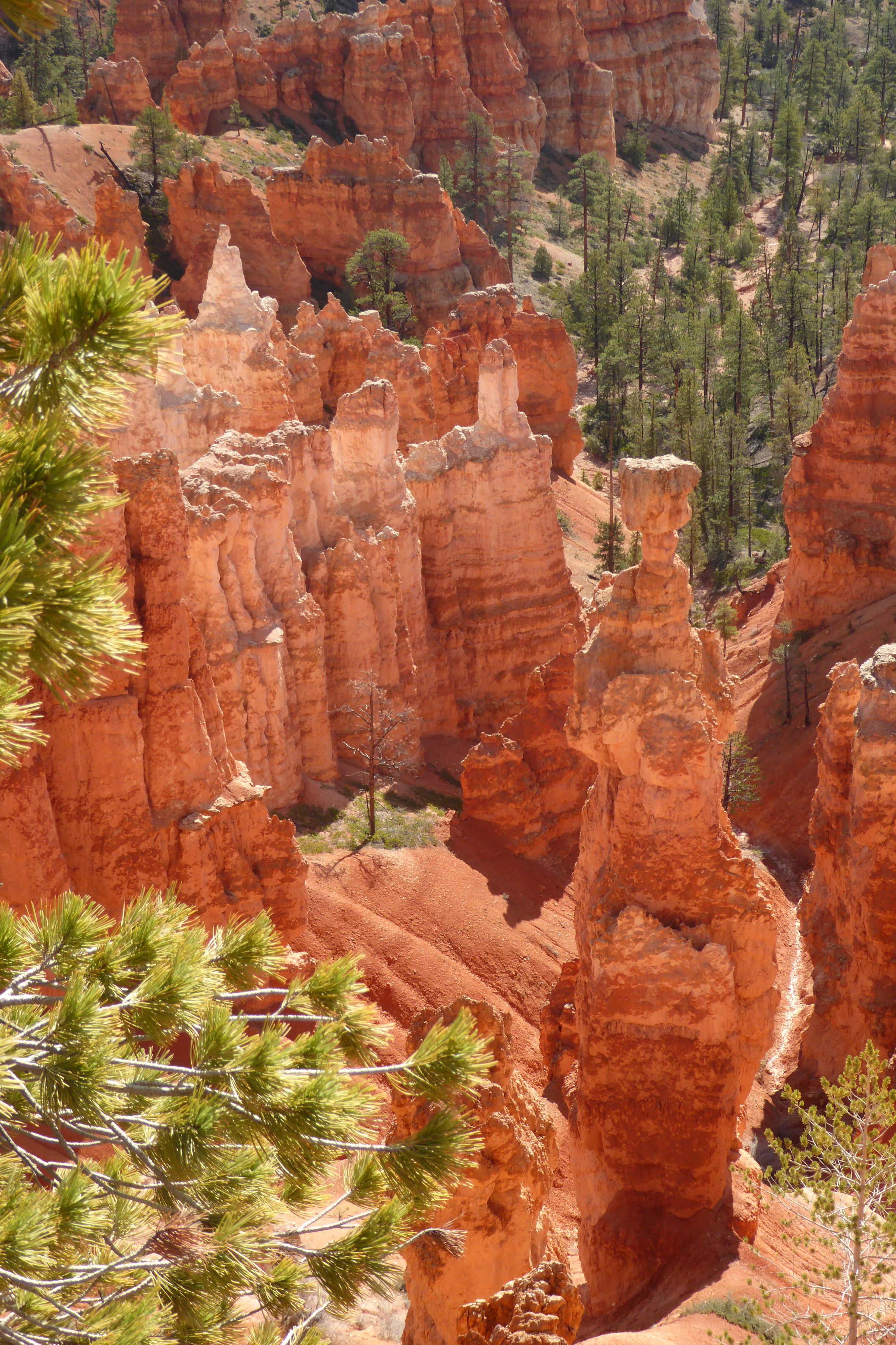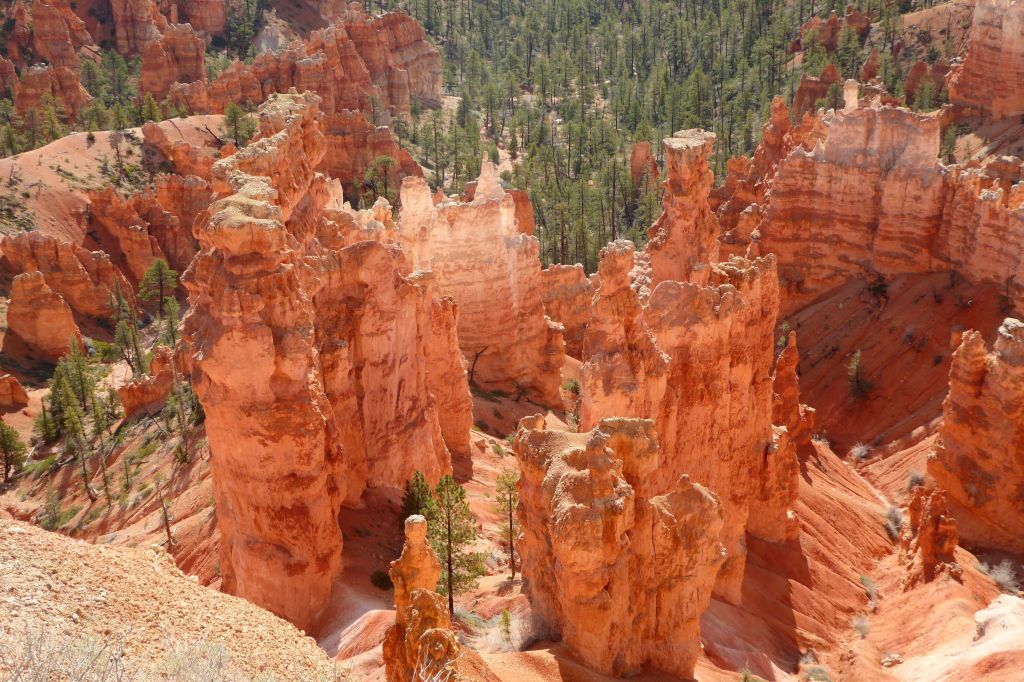 You’ve got to see it to believe it!  It truly is an amazing sight, standing at the top of Bryce’s Amphitheater and looking down into a bowl of hoodoos!  These irregular-shaped rock spires consist of relatively soft rock topped by harder, less easily eroded stone that protects each column from the elements.  These spires range in size from the height of an average human to heights exceeding a 10-story building.