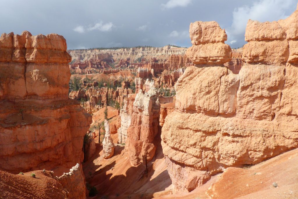 Descending Queen’s Garden Trail provided a different viewing perspective of the hoodoos. As you can see from the photos, the weather kept changing drastically! It went from cloudy, to sunny, to cloudy, several times with some added precipitation sprinkled in! My day pack came in handy for cramming in and pulling out my vest and jacket several times.