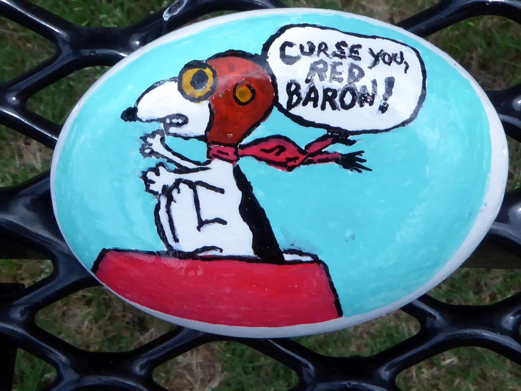 Snoopy— uh, World War I Flying Ace— must be taking a break from his battle against the Red Baron (real name Manfred Albrecht Freiherr von Richthhofen). He is probably exhausted, although he had just enough strength to call out, “Curse you, Red Baron!” as he often did following previous battles.
